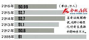 安徽省招委、省教育厅日前召开安徽省2016年普通高校招生考试工作会议,会上首度透露今年安徽的高考(精品课)情况。安徽省今年共报名考生50.99万人(含对口升学考生2.59万人),高考总人数比去年减少3.6万人,这也是安徽省高考人数五年来的首次下降,但对录取率影响不大。