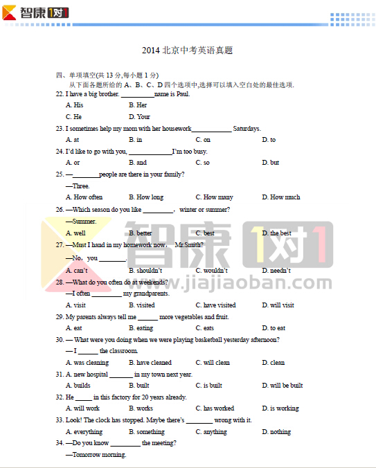 2017年北京中考英语试卷试题及答案