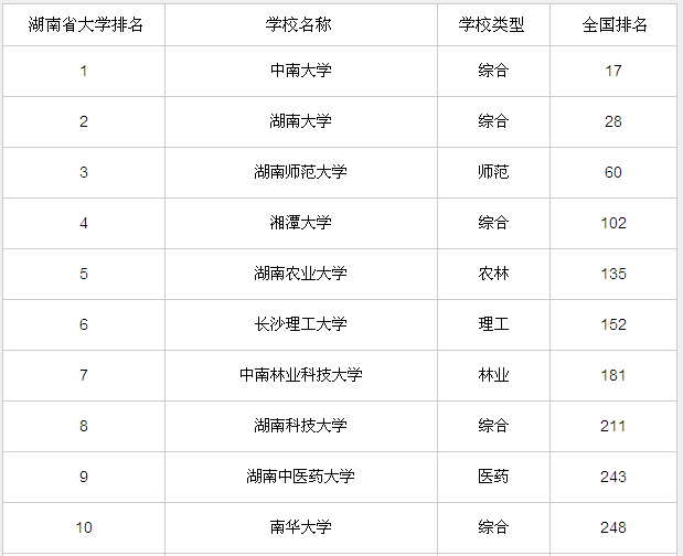教育部湖南省大学排名,最新2017年湖南省大学排名