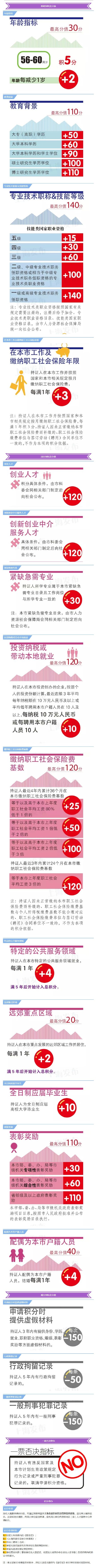 中国上海网今天(2015-08-14 )发布《上海市居住证积分管理办法》,总积分标准分值120分。相对于之前的试行办法,部分指标有所调整。持证人有违反国家及本市计划生育政策规定行为记录或严重刑事犯罪记录的,取消申请积分资格。图解详见下文。…[详情]