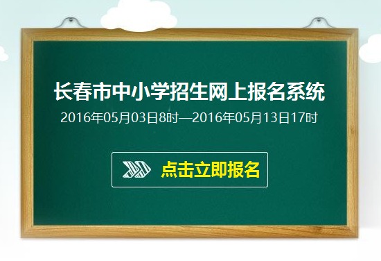 长春市中小学招生网上报名系统2016年05月03日8时—2016年05月13日17时点击立即报名长春市2016年中小学招生网上报名入口 温馨提示 亲爱的家长: 您今年有上小学、升初中的孩子吗?如果有,请您一定为孩子进行网上报名。 没有进行中小学网上报名的适龄儿童、少年将不能获得《义务教育入学通知书》、 不能建立学籍、不能参加民办初中部分学位的电脑派位和优质公办学校空余学位 的电脑派位。 长春市2016年初中小学招生网上报名系统长春市2016年小学招..…[详情]