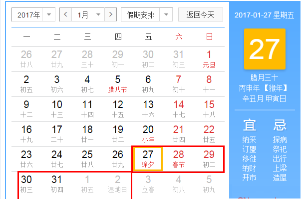 1月27日(星期五,农历除夕)、1月28日(星期六,农历正月初一)、1月29日(星期日,农历正月初二)为法定节假日