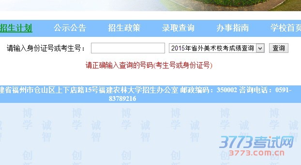 福建农林大学2016年省外艺术类校考成绩公布 我校2016年省外艺术类校考成绩已经公布,考生可以进入学校招生办网站(http://zsb.fafu.edu.cn/)主页,点击“录取查询”栏目,选择“2016年省外艺术校考成绩查询”后,输入身份证号或考生号进行查询。 友情提醒:1.查询结果供参考,未注明“合格”的考生,说明未达到我校1:4合格线,合格考生以接到合格证的正式成绩通知为准;2.合格证预计于4月10日左右寄出,如您的邮寄地址有误,请于4月8日前将新的地址信息传真到:0591-83768179(传真信..…[详情]