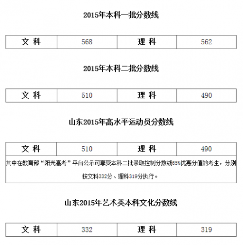 2016年山东投档分数线,山东一本二本三本分数线公布 山东2016年普通高等学校招生录取分数线已公布,文科一本568分,较去年降低11分;理科一本562分,较去年降低10分。…[详情]