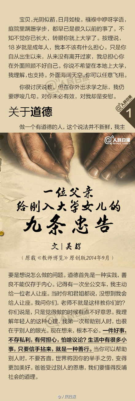 开学季“多读些书,走上社会你就知道,抽出时间来读书是多么不易”,“漂亮不仅仅是指外表,良好的素养会让人更有魅力”,“恋爱很严肃,对待须认真”……一位父亲在女儿即将踏入大学时的九条忠告↓↓一字一句都凝结着伟大而深沉的父爱,www.gxscse.com转给年轻的你!…[详情]