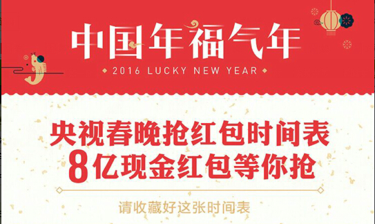 2016年央视春晚抢红包时间表,央视春晚抢红包什么时候中国年福气年 央视春晚抢红包时间表8亿现金红包等你抢,请收藏好这张时间表拼手气红包!…[详情]