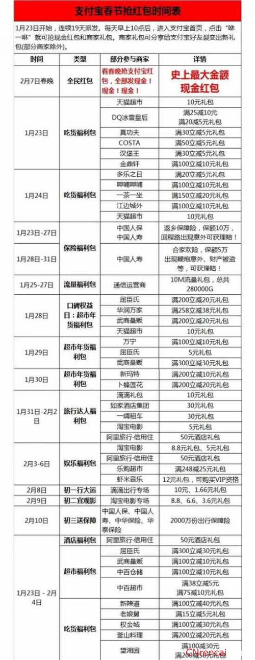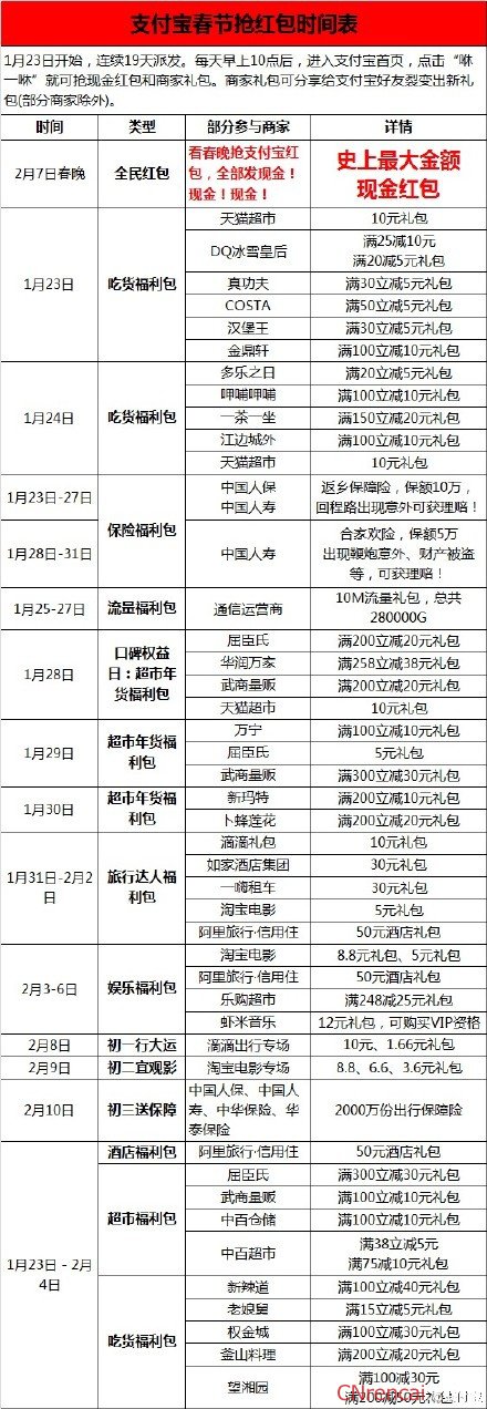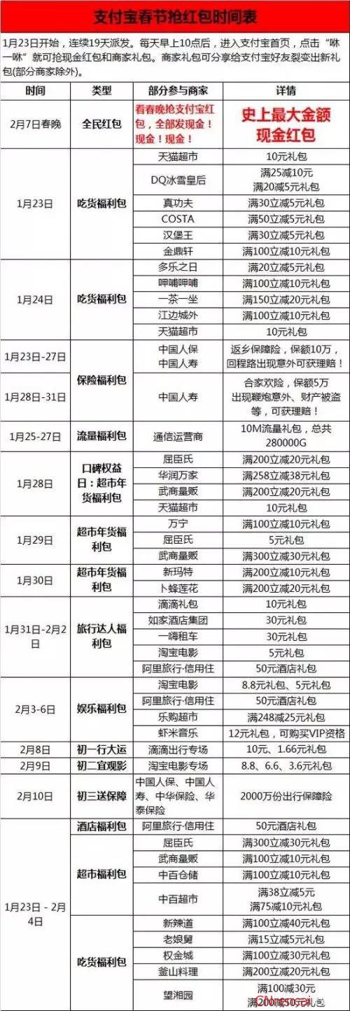 2017年支付宝春节抢红包时间表