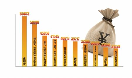 分行业门类看,农、林、牧、渔业34203元,增长16.3%;采矿业46595元,增长12.2%;制造业40486元,增长7.9%;电力、燃气、水的生产和供应业69409元,增长19.3%;建筑业38303元,增长8.5%;批发和零售业39361元,增长12.5%;交通运输、仓储和邮政业55458元,增长6.0%;住宿和餐饮业31013元,增长12.2%;信息传输、软件和信息技术服务业62052元,增长13.6%;金融业80704元,增长8.1%;房地产业43439元,增长8.6%;租赁和商务服务业41304元,增长15.4%;科学研究、技术服务业73246元,增长3.8%;水利、环境和公共设施管理业36497元,增长9.6%;居民服务、修理和其它服务业31642元,增长13.0%;教育业51753元,增长6.3%;卫生和社会工作61092元,增长6.2%;文化体育和娱乐业45614元,增长5.5%;公共管理、社会保障和社会组织52062元,增长7.0%。