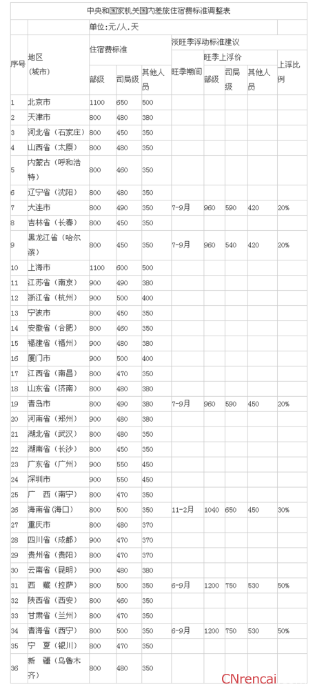 昨日,财政部下发《关于调整中央和国家机关差旅住宿费标准等有关问题的通知》(以下简称《通知》),《通知》提出自2016年1月1日起,调整2013年下发的《中央和国家机关差旅费管理办法》所规定的差旅住宿费标准。 其中,调整北京、上海等11个城市部级干部住宿费标准、7个城市司局级干部住宿费标准和33个城市处级及以下干部住宿费标准。 小编发现,原标准规定的部级干部住宿费标准均为800元,城市地区之间没有差别。此次11个城市部级干部住宿费标准进行调整,也各有差异,北京和上海上调最多,从800元提高到1100元,上调300元,而南京、杭州、..…[详情]