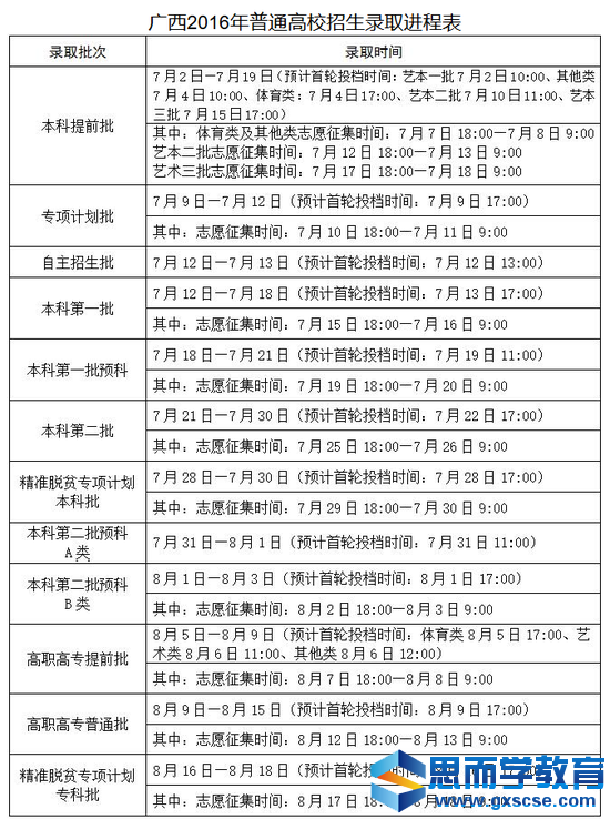 广西省2016年普通高校招生录取工作于7月2日至8月18日进行,具体时间安排如下: