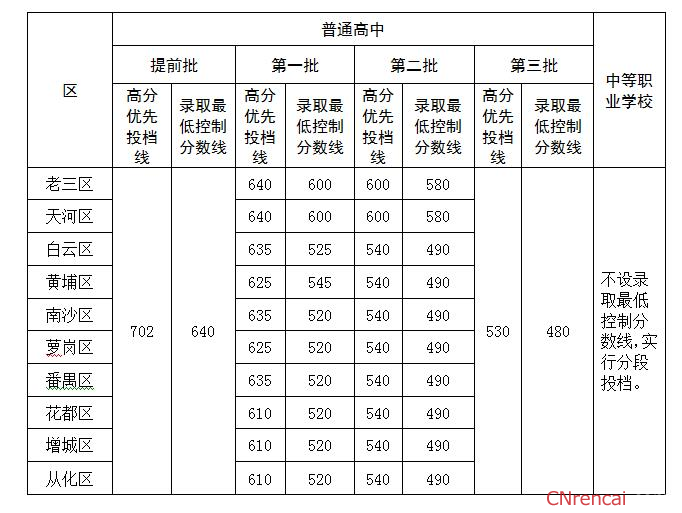 2016年广州中考分数线已经出炉,下面是2016年广州市高中阶段学校招生各批次录取最低控制分数线区普通高中中等职业学校提前批第一批第二批第三批高分优先投档线录取最低控制分数线高分优先投档线录取最低控制分数线高分优先投档线录取最低控制分数线高分优先投档线录取最低控制分数线老三区702640640600600580530485不设录取最低控制分数线,实行分段投档。天河区640600600580白云区635520540490黄埔区625530540490南沙区635515540490番禺区635515540490花都区610515540490从化区610515540490增城区610515540490 注:“老三区”指..…[详情]
