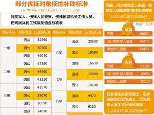 自改革开放以来,国家第21次提高残疾军人残疾抚恤金标准,第24次提高烈属定期抚恤金标准和在乡退伍红军老战士生活补助标准,也是近年来优抚对象提标幅度较大的一次。今年中央财政继续加大资金支持力度,此次提标新增第四季度投入经费15.7亿元,截至目前,共安排2014年优抚对象抚恤和生活补助经费306亿元。 残疾军人、伤残人民警察、伤残国家机关工作人员、 伤残民兵民工残疾抚恤金标准表 (从2014年10月1日起执行)单位:元/年残疾等级残疾性质抚恤金标准一级因战52360因公50700因病49040二级因战47380因公44890因病43210三..…[详情]