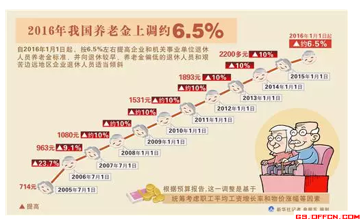 2016年陕西省企业退休养老金上调方案,陕西省企业退休增资方案信息如下: 陕西省政府工作报告提出,2016年将继续提高退休人员基本养老金标准。提交审查的预算报告写明,自2016年1月1日起,按6.5%左右提高企业和机关事业单位退休人员养老金标准,并向退休较早、养老金偏低的退休人员和艰苦边远地区企业退休人员适当倾斜。 这意味着在2005年到2015年连续11年调整企业退休人员基本养老金基础上,2016年企业退休人员养老金将实现“十二连涨”。…[详情]
