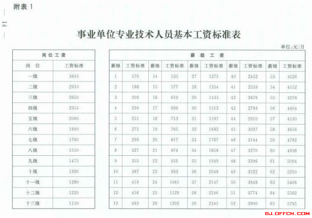 从10月1日起,调整事业单位工作人员基本工资标准,同时将部分绩效工资纳入基本工资;没有实施绩效工资的,从应纳入绩效工资的项目中纳入。 调整后的岗位工资标准,专业技术人员由现行的550元至2800元分别提高到1150元至3810元,管理人员由现行的540元至830元分别提高到1130元至2600元分别提高到170元至5795,工人由现行的70元至915元分别提高到150元1855元(调整后的工资标准见附表1至3)。 …[详情]