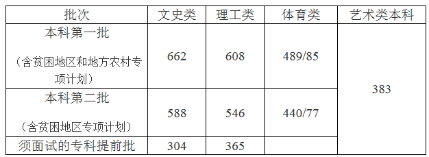 2015年我省本科第一批、第二批及艺术类本科、须面试的专科提前批的分数线已确定,现向广大考生公告如下: 本科第一批(含贫困地区和地方农村专项计划):文史类662分。…[详情]