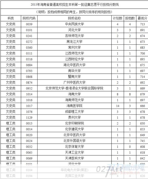 附表:2015年海南省普通高校招生本科第一批征集志愿平行投档分数线…[详情]