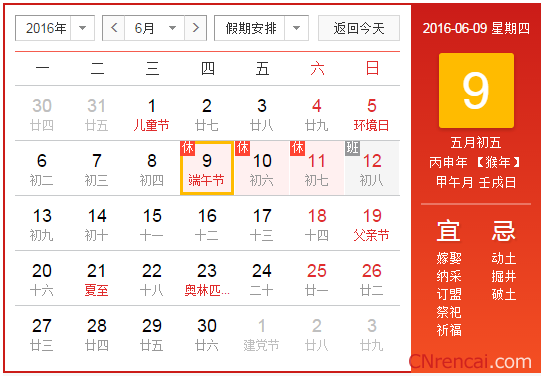 端午节放假安排通知2016年 2016年端午节放假安排时间通知: 2016年6月9日至6月11日放假公休,共3天 6月9日(星期四,农历端午节当日)为国家法定节假日 6月11日(星期日)公休 6月12日(星期日)公休调至6月10日(星期五) 6月12日(星期日)照常上班。 端午节习俗: 我国民间过端午节是较为隆重的,庆祝的活动也是各种各样,比较普遍的活动有以下种种形式: 赛龙舟:…[详情]