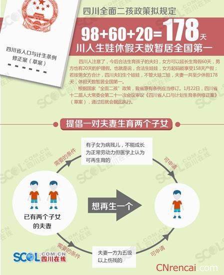 四川拟规定:夫妻可休产假陪护假178天 暂居全国第一 四川人注意了,今后合法生育孩子的夫妇,女方可以延长生育假60天,男方也有20天的护理假。也就是说,合法生娃娃,女方起码能享受158天产假;若按男女方合计,四川夫妇生个娃娃,不管大娃二娃,夫妻一共至少休假178天,休假天数暂居全国第一。 根据国家“全面二孩”政策,我省原有条例应当修订。1月22日,四川省十二届人大常委会第二十一次会议审议《四川省人口与计划生育条例修正案》(草案),通过后就会据此执行。 98+60+20 川人生娃娃夫妻可休178天 按照国家..…[详情]