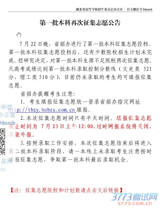2017年湖北高考一本7月22日征集志愿和缺额计划分数线公布