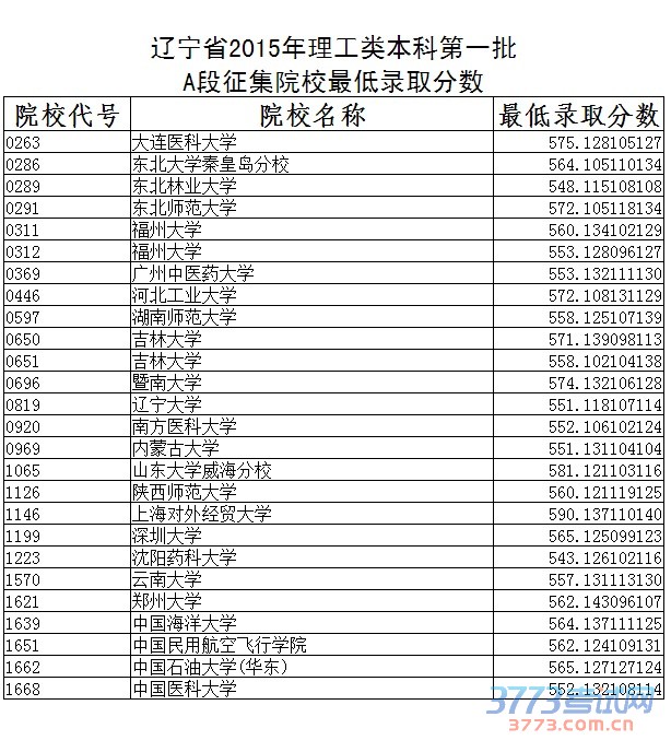 2017年辽宁高考一本A段征集理科院校录取分数线