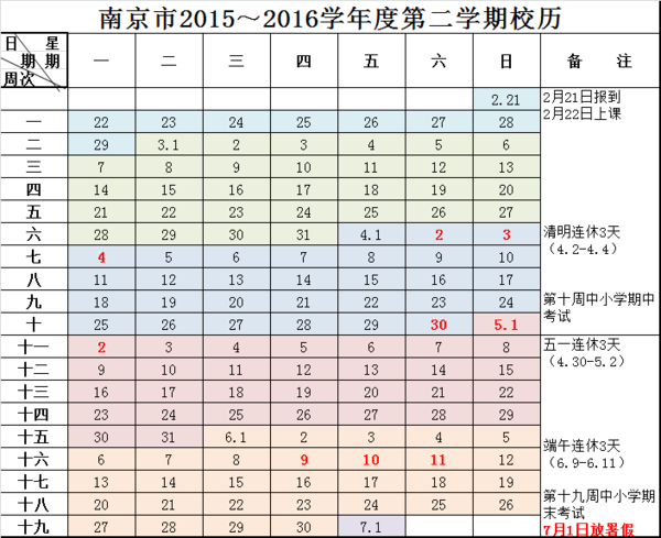南京2015-2016学年第二学期校历出及暑假放假时间安排