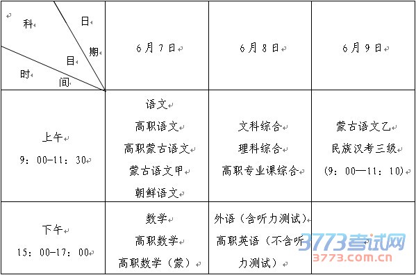关于2016年内蒙古自治区普通高考时间安排的通知 各盟市招生考试委员会: 依据教育部有关文件精神,现就我区普通高考各科目考试时间做如下安排,请各地做好宣传及相关工作: 一、普通高校招生全国统一考试(含高等职业院校对口招收中等职业学校毕业生单独考试)2016年6月7日开始,各科目考试时间安排如下: 二、高等职业院校对口招收中等职业学校毕业生单独考试体育类专业课综合考试时间为6月13日,考试地点为内蒙古体育职业学院(呼和浩特市新城区成吉思汗大街..…[详情]
