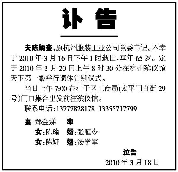 一、注意事项 发讣告的时候要注意下面四点: 1、讣告必须在遗体告别仪式之前发出,以便死者亲友与有关方面人士及时地做出必要的准备,如送花圈、挽联等。 2、讣告只能使用黄、白两色纸,长辈之丧用白色,幼辈之丧用黄色。 3、讣告必须使用黑色,四周加黑框,以示哀悼。 4、讣告的语言要求准确、简练、沉痛、严肃。 特别提示:现代的书面语与20世纪50年代前的书面语存在着一定的差异,如在讣告中常用的“先考”(已去世的父亲)、“先妣”(已去世的母亲)早已被“先父”、“先母”所代替。 二、范文 丧父 不孝..…[详情]