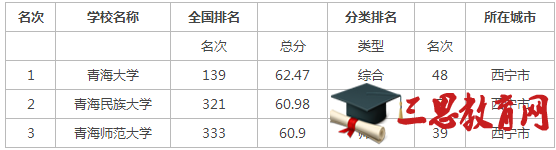 地区排名学校名称类型全国排名总分科学研究人才培养综合声誉办学类型、等级和层次办学类型星级排名办学层次1青海大学综合14662.4960.8163.1066.74区域研究型2青海民族大学民族23961.8160.3763.2261.64应用型3青海师范大学师范29361.6560.4563.1260.16应用型…[详情]