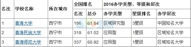 2016青海省最佳大学排行榜名次学校名称所在城市全国排名2016办学类型、等级和层次名次总分办学类型星级排名办学层次1青海大学西宁市18661.84区域研究型3星级中国知名大学2青海民族大学西宁市31961.02应用型1星级区域知名大学3青海师范大学西宁市33760.92应用型1星级区域知名大学 2016青海省最佳独立学院排行榜…[详情]