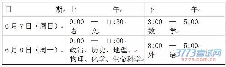 具体安排如下:6月7日周日,上午9:00-11:30,语文;下午15:00-17:00,数学;6月8日周一,上午9:00-11:00,政治、历史、地理、物理、化学、生命科学;下午15:00-17:00,外语。