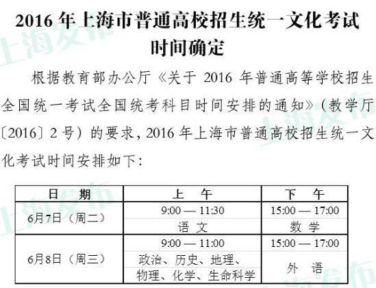 根据教育部办公厅《关于2016年普通高等学校招生全国统一考试全国统考科目时间安排的通知》(教学厅〔2016〕2号)的要求, 2016年上海市普通高校招生统一文化考试时间安排如下: 日 期上 午下 午6月7日(周二)9:00 — 11:30语 文15:00 — 17:00数 学6月8日(周三)9:00 — 11:00政治、历史、地理、 物理、化学、生命科学15:00 — 17:00外 &n..;…[详情]